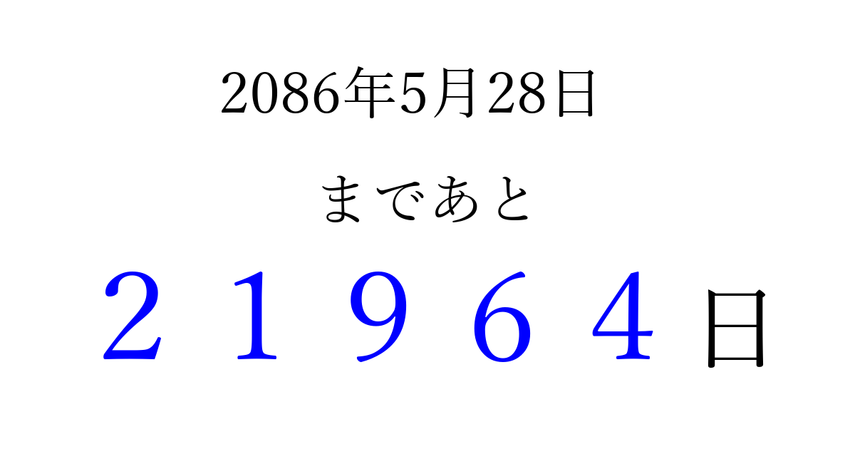 2086年5月28日(火)まで あと 99999 日です 追加すると、トップページからすぐ選べるようになります ※2026/04/09現在の結果です。 最新の状態に更新する ↓シェアして、タイムライン上にカウントダウンを表示しよう!↓ 📤 この結果を共有する Tweet シェア Threads Bluesky 別の日付でカウントダウン 2086年5月のカレンダー このページをブックマークに追加すると、いつでもカウントダウンを確認できます。 (PC: Ctrl+D / Mac: ⌘+D) hitome-notes.comでは以下のページも運営しています。 指定日と期間から日付を計算 | ガチャ確率計算・シミュレーション | プライバシー・ポリシー 運営者:Avocado