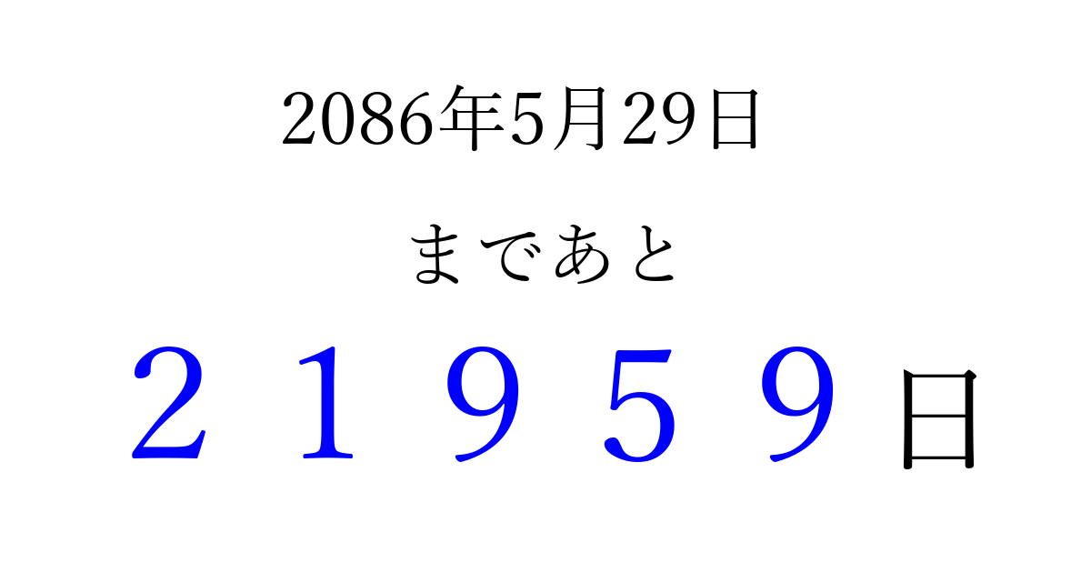 2086年5月29日(水)まで あと 99999 日です 追加すると、トップページからすぐ選べるようになります ※2026/04/15現在の結果です。 最新の状態に更新する ↓シェアして、タイムライン上にカウントダウンを表示しよう!↓ 📤 この結果を共有する Tweet シェア Threads Bluesky 別の日付でカウントダウン 2086年5月のカレンダー このページをブックマークに追加すると、いつでもカウントダウンを確認できます。 (PC: Ctrl+D / Mac: ⌘+D) hitome-notes.comでは以下のページも運営しています。 指定日と期間から日付を計算 | ガチャ確率計算・シミュレーション | プライバシー・ポリシー 運営者:Avocado