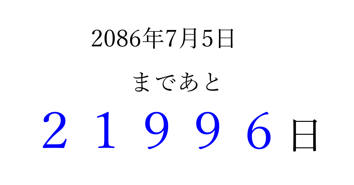 2086年7月5日(金)まで あと 99999 日です 追加すると、トップページからすぐ選べるようになります ※2026/04/15現在の結果です。 最新の状態に更新する ↓シェアして、タイムライン上にカウントダウンを表示しよう!↓ 📤 この結果を共有する Tweet シェア Threads Bluesky 別の日付でカウントダウン 2086年7月のカレンダー このページをブックマークに追加すると、いつでもカウントダウンを確認できます。 (PC: Ctrl+D / Mac: ⌘+D) hitome-notes.comでは以下のページも運営しています。 指定日と期間から日付を計算 | ガチャ確率計算・シミュレーション | プライバシー・ポリシー 運営者:Avocado