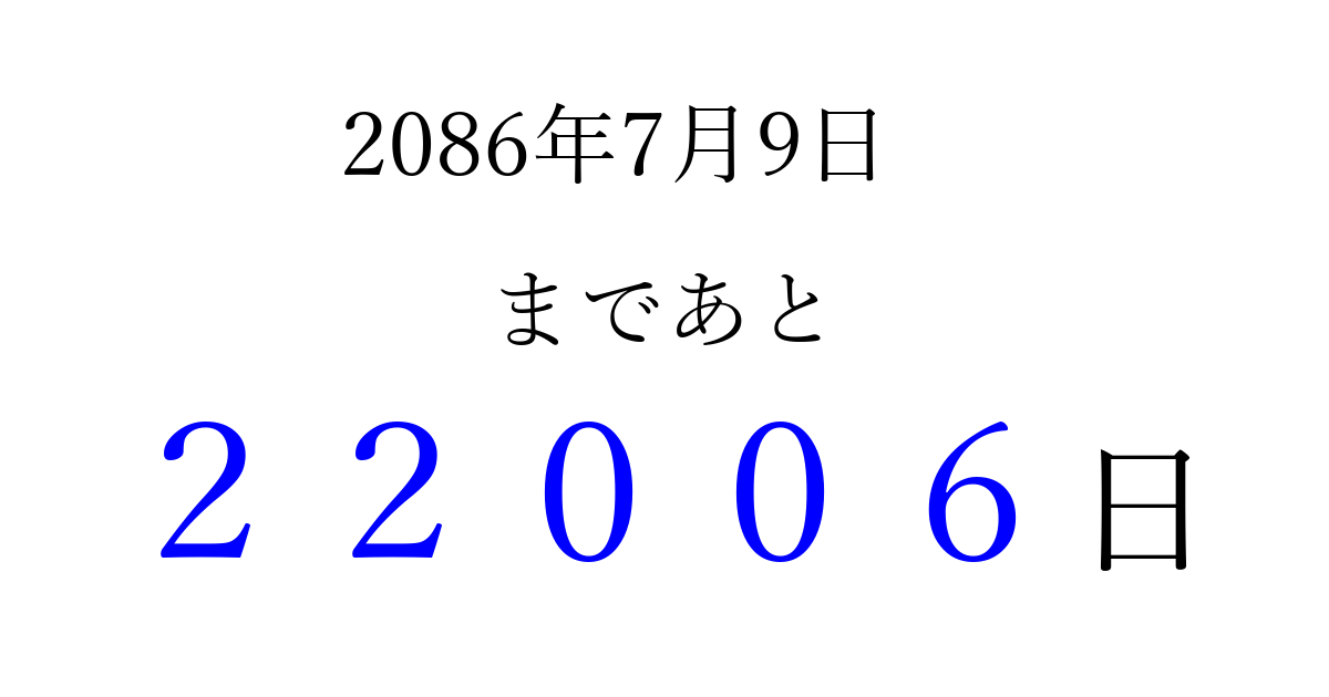 2086年7月9日(火)まで あと 99999 日です 追加すると、トップページからすぐ選べるようになります ※2026/04/09現在の結果です。 最新の状態に更新する ↓シェアして、タイムライン上にカウントダウンを表示しよう!↓ 📤 この結果を共有する Tweet シェア Threads Bluesky 別の日付でカウントダウン 2086年7月のカレンダー このページをブックマークに追加すると、いつでもカウントダウンを確認できます。 (PC: Ctrl+D / Mac: ⌘+D) hitome-notes.comでは以下のページも運営しています。 指定日と期間から日付を計算 | ガチャ確率計算・シミュレーション | プライバシー・ポリシー 運営者:Avocado