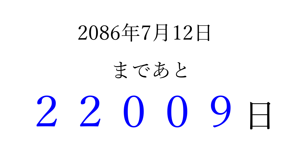 2086年7月12日(金)まで あと 99999 日です 追加すると、トップページからすぐ選べるようになります ※2026/04/09現在の結果です。 最新の状態に更新する ↓シェアして、タイムライン上にカウントダウンを表示しよう!↓ 📤 この結果を共有する Tweet シェア Threads Bluesky 別の日付でカウントダウン 2086年7月のカレンダー このページをブックマークに追加すると、いつでもカウントダウンを確認できます。 (PC: Ctrl+D / Mac: ⌘+D) hitome-notes.comでは以下のページも運営しています。 指定日と期間から日付を計算 | ガチャ確率計算・シミュレーション | プライバシー・ポリシー 運営者:Avocado