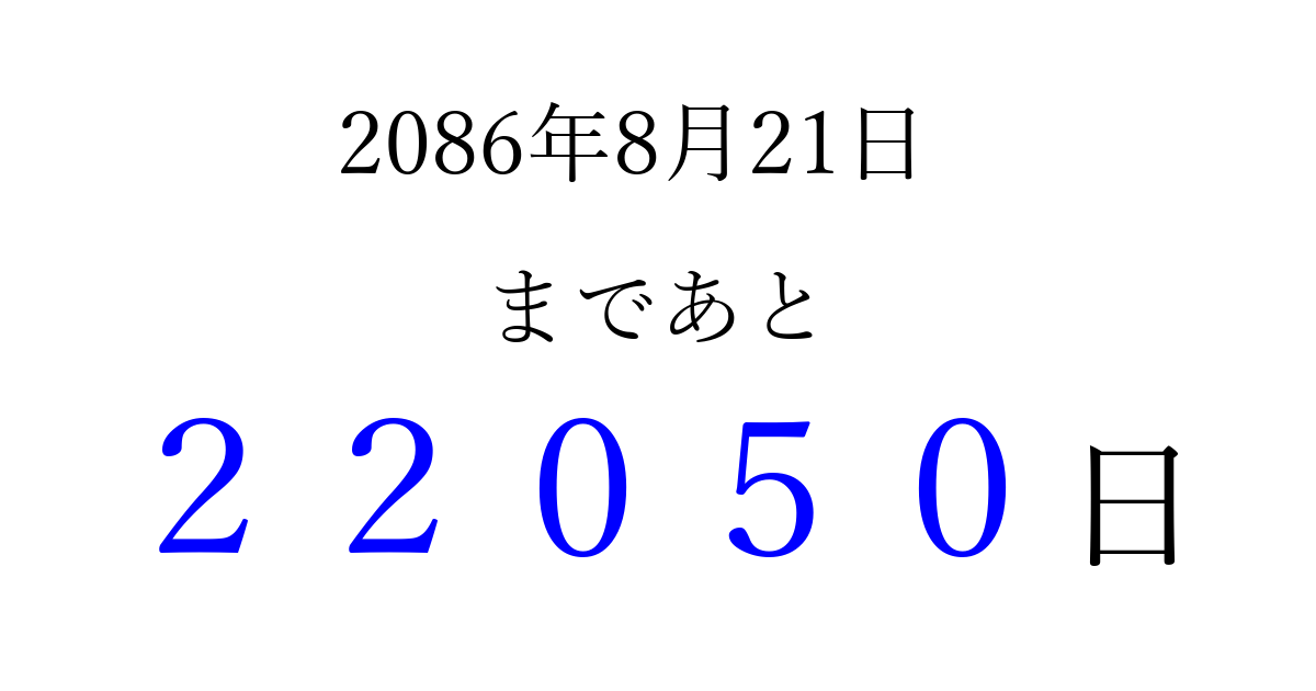 2086年8月21日(水)まで あと 99999 日です 追加すると、トップページからすぐ選べるようになります ※2026/04/08現在の結果です。 最新の状態に更新する ↓シェアして、タイムライン上にカウントダウンを表示しよう!↓ 📤 この結果を共有する Tweet シェア Threads Bluesky 別の日付でカウントダウン 2086年8月のカレンダー このページをブックマークに追加すると、いつでもカウントダウンを確認できます。 (PC: Ctrl+D / Mac: ⌘+D) hitome-notes.comでは以下のページも運営しています。 指定日と期間から日付を計算 | ガチャ確率計算・シミュレーション | プライバシー・ポリシー 運営者:Avocado