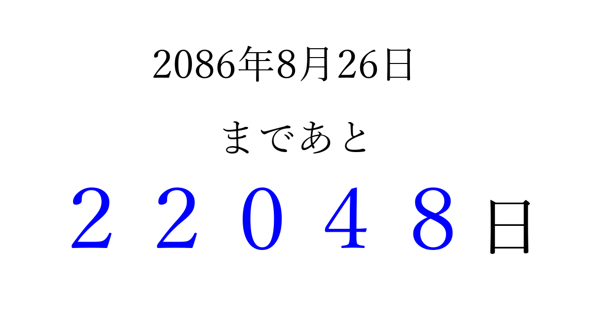 2086年8月26日(月)まで あと 99999 日です 追加すると、トップページからすぐ選べるようになります ※2026/04/15現在の結果です。 最新の状態に更新する ↓シェアして、タイムライン上にカウントダウンを表示しよう!↓ 📤 この結果を共有する Tweet シェア Threads Bluesky 別の日付でカウントダウン 2086年8月のカレンダー このページをブックマークに追加すると、いつでもカウントダウンを確認できます。 (PC: Ctrl+D / Mac: ⌘+D) hitome-notes.comでは以下のページも運営しています。 指定日と期間から日付を計算 | ガチャ確率計算・シミュレーション | プライバシー・ポリシー 運営者:Avocado