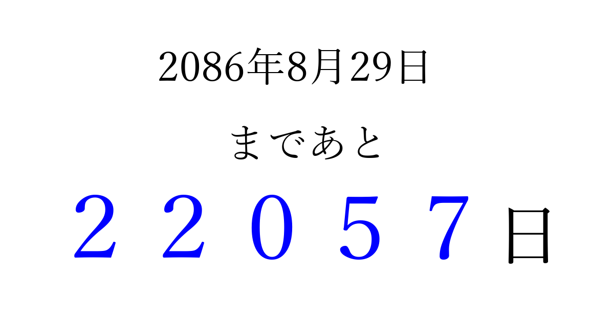 2086年8月29日(木)まで あと 99999 日です 追加すると、トップページからすぐ選べるようになります ※2026/04/09現在の結果です。 最新の状態に更新する ↓シェアして、タイムライン上にカウントダウンを表示しよう!↓ 📤 この結果を共有する Tweet シェア Threads Bluesky 別の日付でカウントダウン 2086年8月のカレンダー このページをブックマークに追加すると、いつでもカウントダウンを確認できます。 (PC: Ctrl+D / Mac: ⌘+D) hitome-notes.comでは以下のページも運営しています。 指定日と期間から日付を計算 | ガチャ確率計算・シミュレーション | プライバシー・ポリシー 運営者:Avocado