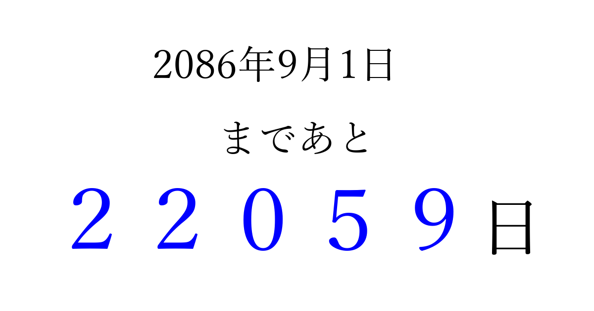 2086年9月1日(日)まで あと 99999 日です 追加すると、トップページからすぐ選べるようになります ※2026/04/10現在の結果です。 最新の状態に更新する ↓シェアして、タイムライン上にカウントダウンを表示しよう!↓ 📤 この結果を共有する Tweet シェア Threads Bluesky 別の日付でカウントダウン 2086年9月のカレンダー このページをブックマークに追加すると、いつでもカウントダウンを確認できます。 (PC: Ctrl+D / Mac: ⌘+D) hitome-notes.comでは以下のページも運営しています。 指定日と期間から日付を計算 | ガチャ確率計算・シミュレーション | プライバシー・ポリシー 運営者:Avocado