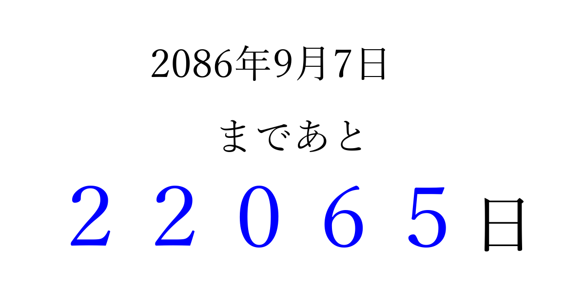 2086年9月7日(土)まで あと 99999 日です 追加すると、トップページからすぐ選べるようになります ※2026/04/10現在の結果です。 最新の状態に更新する ↓シェアして、タイムライン上にカウントダウンを表示しよう!↓ 📤 この結果を共有する Tweet シェア Threads Bluesky 別の日付でカウントダウン 2086年9月のカレンダー このページをブックマークに追加すると、いつでもカウントダウンを確認できます。 (PC: Ctrl+D / Mac: ⌘+D) hitome-notes.comでは以下のページも運営しています。 指定日と期間から日付を計算 | ガチャ確率計算・シミュレーション | プライバシー・ポリシー 運営者:Avocado