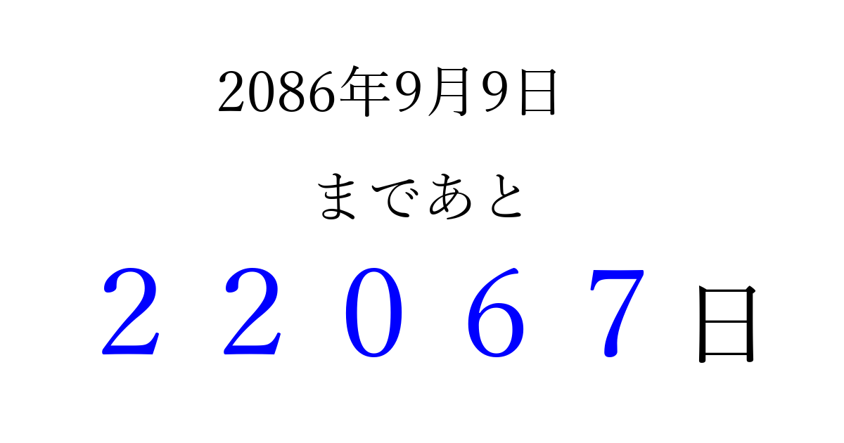 2086年9月9日(月)まで あと 99999 日です 追加すると、トップページからすぐ選べるようになります ※2026/04/10現在の結果です。 最新の状態に更新する ↓シェアして、タイムライン上にカウントダウンを表示しよう!↓ 📤 この結果を共有する Tweet シェア Threads Bluesky 別の日付でカウントダウン 2086年9月のカレンダー このページをブックマークに追加すると、いつでもカウントダウンを確認できます。 (PC: Ctrl+D / Mac: ⌘+D) hitome-notes.comでは以下のページも運営しています。 指定日と期間から日付を計算 | ガチャ確率計算・シミュレーション | プライバシー・ポリシー 運営者:Avocado
