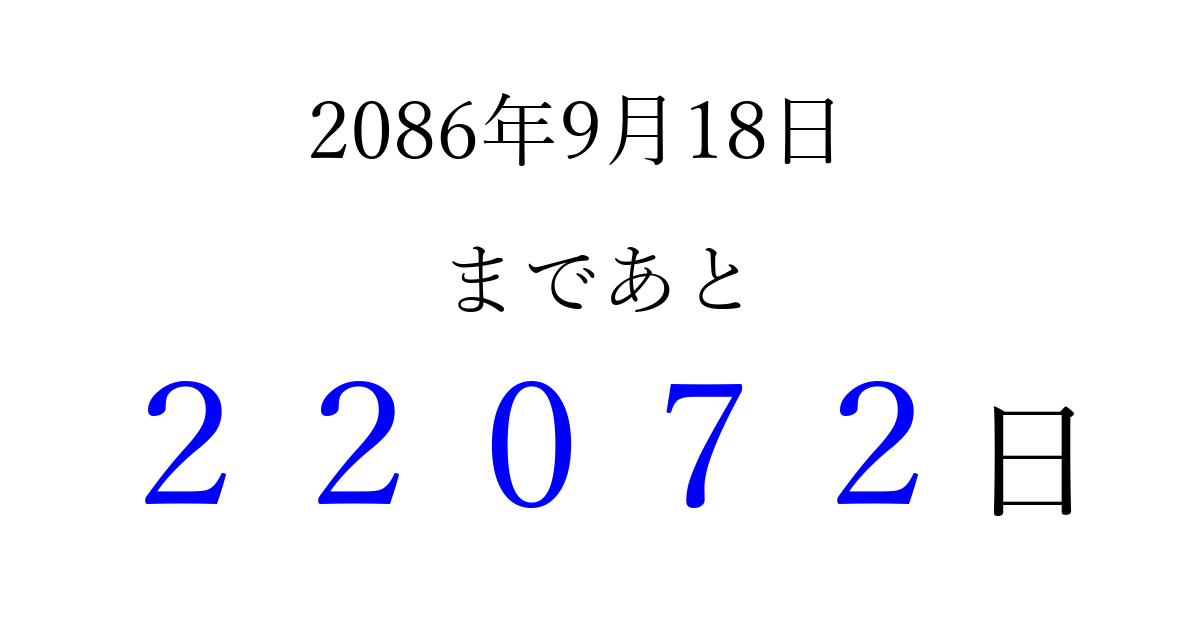 2086年9月18日(水)まで あと 99999 日です 追加すると、トップページからすぐ選べるようになります ※2026/04/14現在の結果です。 最新の状態に更新する ↓シェアして、タイムライン上にカウントダウンを表示しよう!↓ 📤 この結果を共有する Tweet シェア Threads Bluesky 別の日付でカウントダウン 2086年9月のカレンダー このページをブックマークに追加すると、いつでもカウントダウンを確認できます。 (PC: Ctrl+D / Mac: ⌘+D) hitome-notes.comでは以下のページも運営しています。 指定日と期間から日付を計算 | ガチャ確率計算・シミュレーション | プライバシー・ポリシー 運営者:Avocado