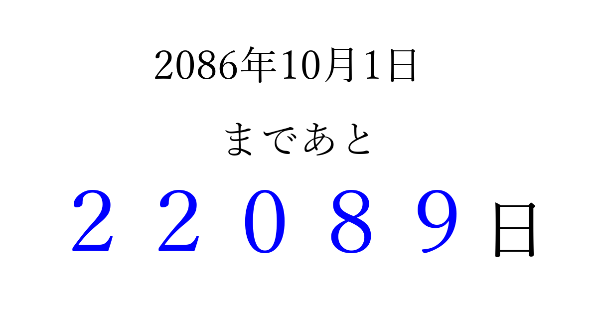 2086年10月1日(火)まで あと 99999 日です 追加すると、トップページからすぐ選べるようになります ※2026/04/10現在の結果です。 最新の状態に更新する ↓シェアして、タイムライン上にカウントダウンを表示しよう!↓ 📤 この結果を共有する Tweet シェア Threads Bluesky 別の日付でカウントダウン 2086年10月のカレンダー このページをブックマークに追加すると、いつでもカウントダウンを確認できます。 (PC: Ctrl+D / Mac: ⌘+D) hitome-notes.comでは以下のページも運営しています。 指定日と期間から日付を計算 | ガチャ確率計算・シミュレーション | プライバシー・ポリシー 運営者:Avocado