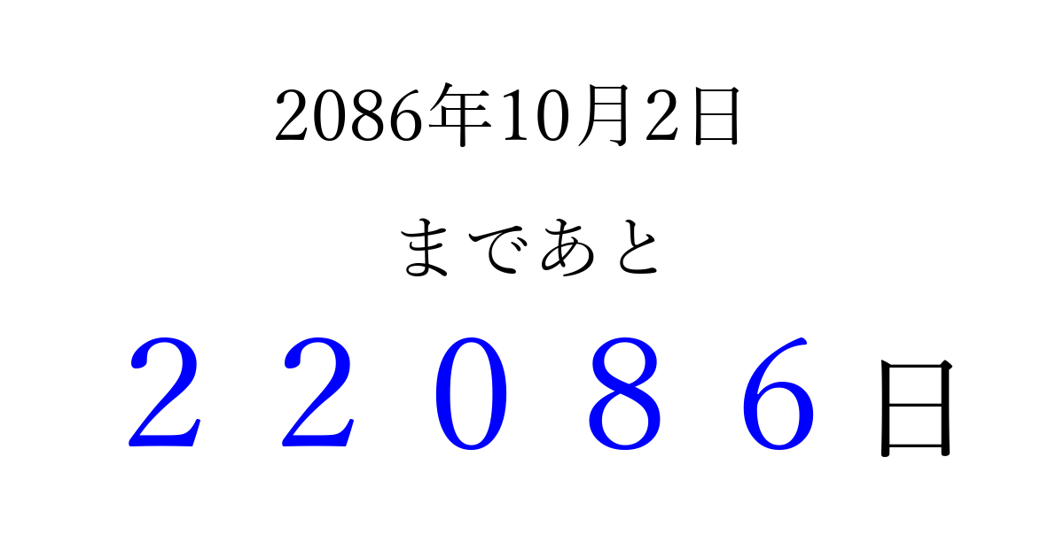 2086年10月2日(水)まで あと 99999 日です 追加すると、トップページからすぐ選べるようになります ※2026/04/14現在の結果です。 最新の状態に更新する ↓シェアして、タイムライン上にカウントダウンを表示しよう!↓ 📤 この結果を共有する Tweet シェア Threads Bluesky 別の日付でカウントダウン 2086年10月のカレンダー このページをブックマークに追加すると、いつでもカウントダウンを確認できます。 (PC: Ctrl+D / Mac: ⌘+D) hitome-notes.comでは以下のページも運営しています。 指定日と期間から日付を計算 | ガチャ確率計算・シミュレーション | プライバシー・ポリシー 運営者:Avocado