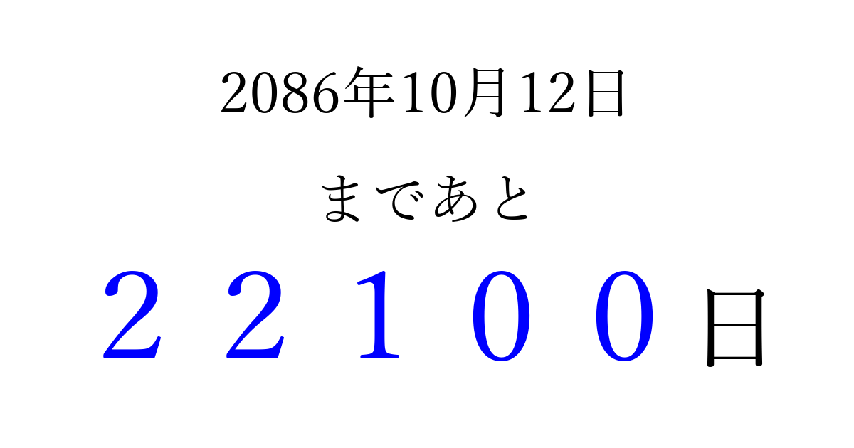 2086年10月12日(土)まで あと 99999 日です 追加すると、トップページからすぐ選べるようになります ※2026/04/10現在の結果です。 最新の状態に更新する ↓シェアして、タイムライン上にカウントダウンを表示しよう!↓ 📤 この結果を共有する Tweet シェア Threads Bluesky 別の日付でカウントダウン 2086年10月のカレンダー このページをブックマークに追加すると、いつでもカウントダウンを確認できます。 (PC: Ctrl+D / Mac: ⌘+D) hitome-notes.comでは以下のページも運営しています。 指定日と期間から日付を計算 | ガチャ確率計算・シミュレーション | プライバシー・ポリシー 運営者:Avocado