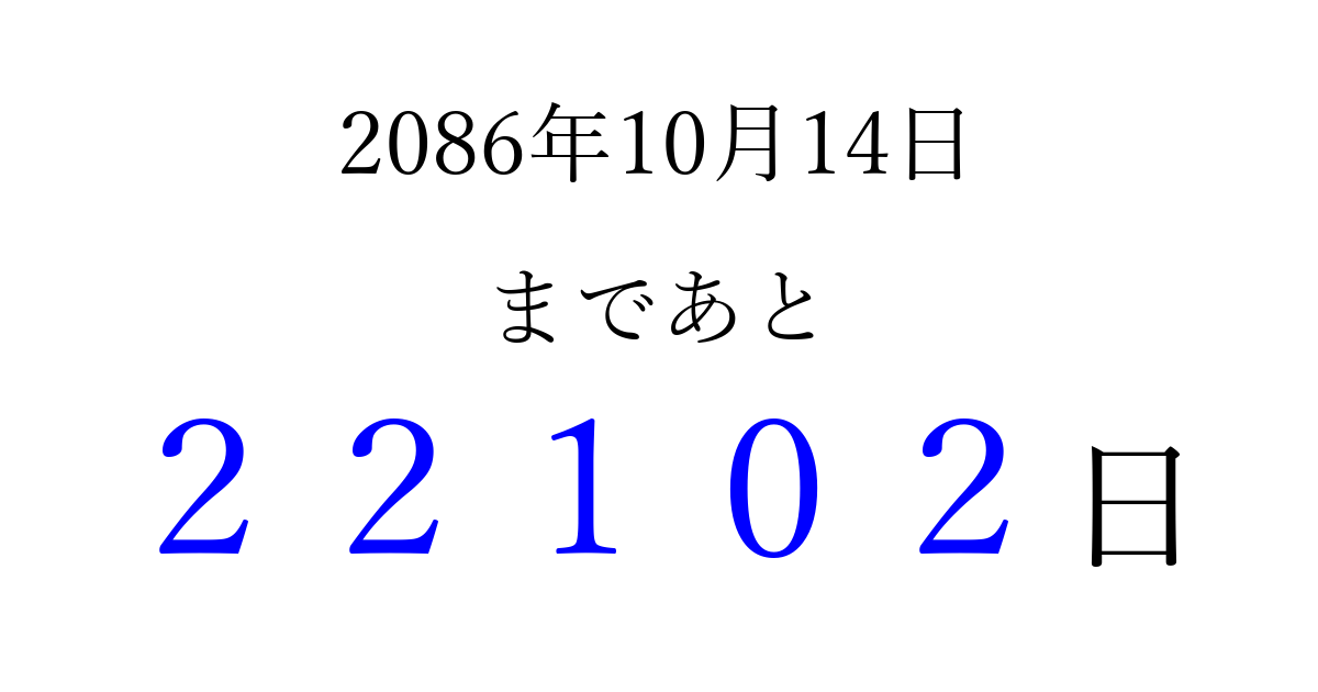 2086年10月14日(月)まで あと 99999 日です 追加すると、トップページからすぐ選べるようになります ※2026/04/10現在の結果です。 最新の状態に更新する ↓シェアして、タイムライン上にカウントダウンを表示しよう!↓ 📤 この結果を共有する Tweet シェア Threads Bluesky 別の日付でカウントダウン 2086年10月のカレンダー このページをブックマークに追加すると、いつでもカウントダウンを確認できます。 (PC: Ctrl+D / Mac: ⌘+D) hitome-notes.comでは以下のページも運営しています。 指定日と期間から日付を計算 | ガチャ確率計算・シミュレーション | プライバシー・ポリシー 運営者:Avocado