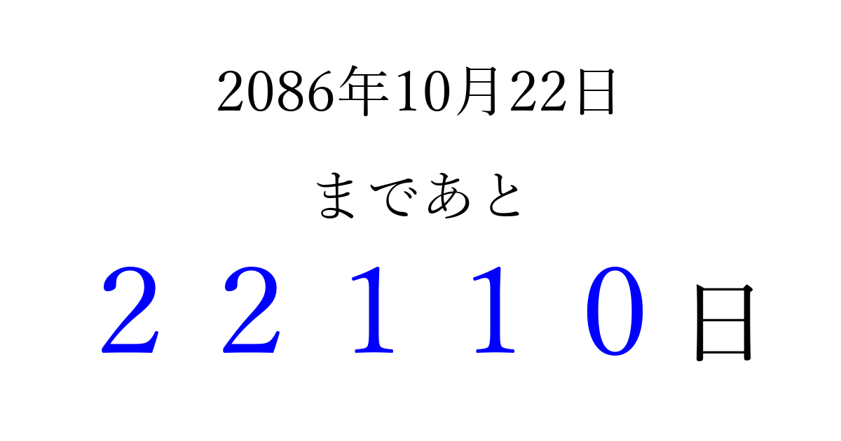 2086年10月22日(火)まで あと 99999 日です 追加すると、トップページからすぐ選べるようになります ※2026/04/10現在の結果です。 最新の状態に更新する ↓シェアして、タイムライン上にカウントダウンを表示しよう!↓ 📤 この結果を共有する Tweet シェア Threads Bluesky 別の日付でカウントダウン 2086年10月のカレンダー このページをブックマークに追加すると、いつでもカウントダウンを確認できます。 (PC: Ctrl+D / Mac: ⌘+D) hitome-notes.comでは以下のページも運営しています。 指定日と期間から日付を計算 | ガチャ確率計算・シミュレーション | プライバシー・ポリシー 運営者:Avocado