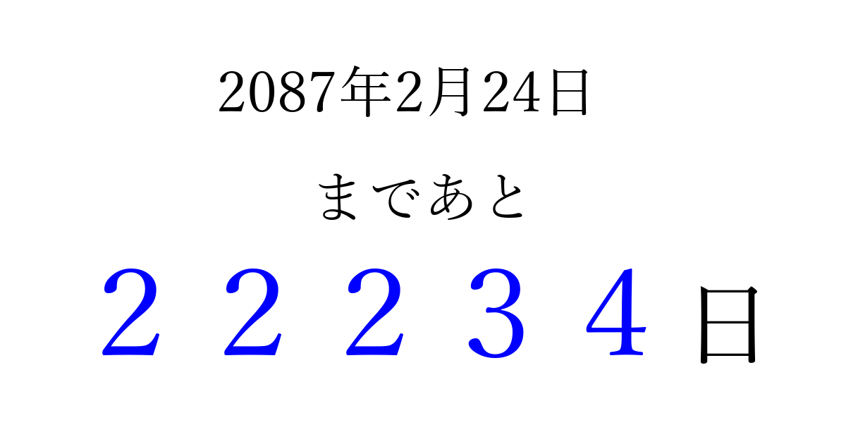 2087年2月24日(月)まで あと 99999 日です 追加すると、トップページからすぐ選べるようになります ※2026/04/11現在の結果です。 最新の状態に更新する ↓シェアして、タイムライン上にカウントダウンを表示しよう!↓ 📤 この結果を共有する Tweet シェア Threads Bluesky 別の日付でカウントダウン 2087年2月のカレンダー このページをブックマークに追加すると、いつでもカウントダウンを確認できます。 (PC: Ctrl+D / Mac: ⌘+D) hitome-notes.comでは以下のページも運営しています。 指定日と期間から日付を計算 | ガチャ確率計算・シミュレーション | プライバシー・ポリシー 運営者:Avocado