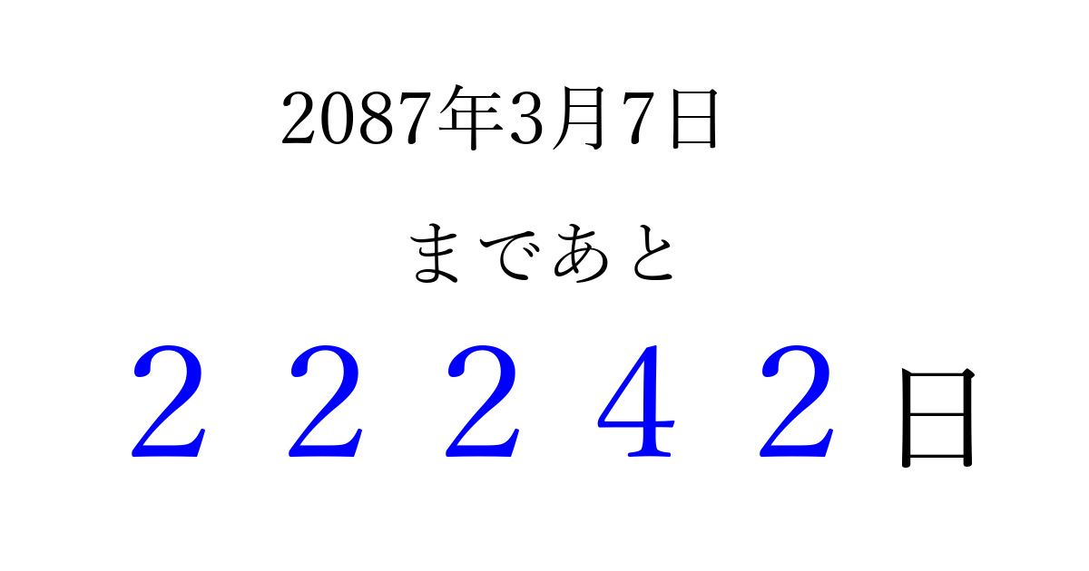 2087年3月7日(金)まで あと 99999 日です 追加すると、トップページからすぐ選べるようになります ※2026/04/14現在の結果です。 最新の状態に更新する ↓シェアして、タイムライン上にカウントダウンを表示しよう!↓ 📤 この結果を共有する Tweet シェア Threads Bluesky 別の日付でカウントダウン 2087年3月のカレンダー このページをブックマークに追加すると、いつでもカウントダウンを確認できます。 (PC: Ctrl+D / Mac: ⌘+D) hitome-notes.comでは以下のページも運営しています。 指定日と期間から日付を計算 | ガチャ確率計算・シミュレーション | プライバシー・ポリシー 運営者:Avocado