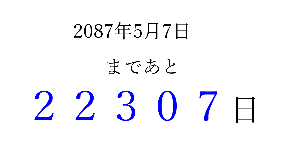 2087年5月7日(水)まで あと 99999 日です 追加すると、トップページからすぐ選べるようになります ※2026/04/10現在の結果です。 最新の状態に更新する ↓シェアして、タイムライン上にカウントダウンを表示しよう!↓ 📤 この結果を共有する Tweet シェア Threads Bluesky 別の日付でカウントダウン 2087年5月のカレンダー このページをブックマークに追加すると、いつでもカウントダウンを確認できます。 (PC: Ctrl+D / Mac: ⌘+D) hitome-notes.comでは以下のページも運営しています。 指定日と期間から日付を計算 | ガチャ確率計算・シミュレーション | プライバシー・ポリシー 運営者:Avocado