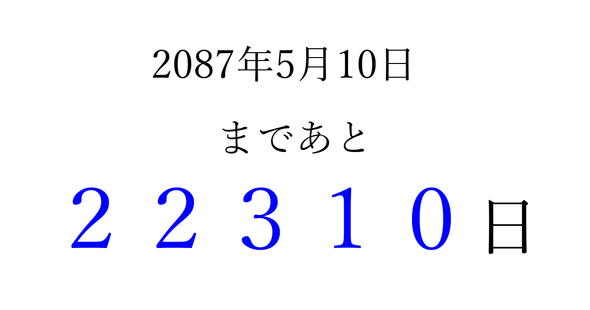 2087年5月10日(土)まで あと 99999 日です 追加すると、トップページからすぐ選べるようになります ※2026/04/10現在の結果です。 最新の状態に更新する ↓シェアして、タイムライン上にカウントダウンを表示しよう!↓ 📤 この結果を共有する Tweet シェア Threads Bluesky 別の日付でカウントダウン 2087年5月のカレンダー このページをブックマークに追加すると、いつでもカウントダウンを確認できます。 (PC: Ctrl+D / Mac: ⌘+D) hitome-notes.comでは以下のページも運営しています。 指定日と期間から日付を計算 | ガチャ確率計算・シミュレーション | プライバシー・ポリシー 運営者:Avocado