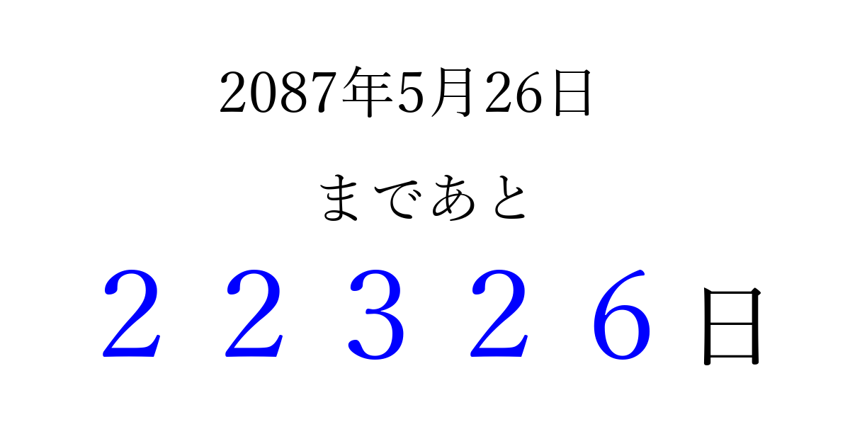 2087年5月26日(月)まで あと 99999 日です 追加すると、トップページからすぐ選べるようになります ※2026/04/10現在の結果です。 最新の状態に更新する ↓シェアして、タイムライン上にカウントダウンを表示しよう!↓ 📤 この結果を共有する Tweet シェア Threads Bluesky 別の日付でカウントダウン 2087年5月のカレンダー このページをブックマークに追加すると、いつでもカウントダウンを確認できます。 (PC: Ctrl+D / Mac: ⌘+D) hitome-notes.comでは以下のページも運営しています。 指定日と期間から日付を計算 | ガチャ確率計算・シミュレーション | プライバシー・ポリシー 運営者:Avocado
