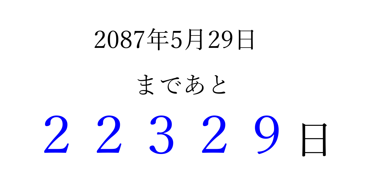 2087年5月29日(木)まで あと 99999 日です 追加すると、トップページからすぐ選べるようになります ※2026/04/10現在の結果です。 最新の状態に更新する ↓シェアして、タイムライン上にカウントダウンを表示しよう!↓ 📤 この結果を共有する Tweet シェア Threads Bluesky 別の日付でカウントダウン 2087年5月のカレンダー このページをブックマークに追加すると、いつでもカウントダウンを確認できます。 (PC: Ctrl+D / Mac: ⌘+D) hitome-notes.comでは以下のページも運営しています。 指定日と期間から日付を計算 | ガチャ確率計算・シミュレーション | プライバシー・ポリシー 運営者:Avocado