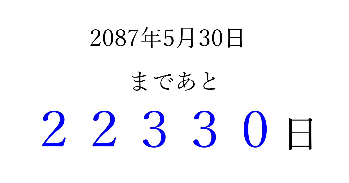 2087年5月30日(金)まで あと 99999 日です 追加すると、トップページからすぐ選べるようになります ※2026/04/10現在の結果です。 最新の状態に更新する ↓シェアして、タイムライン上にカウントダウンを表示しよう!↓ 📤 この結果を共有する Tweet シェア Threads Bluesky 別の日付でカウントダウン 2087年5月のカレンダー このページをブックマークに追加すると、いつでもカウントダウンを確認できます。 (PC: Ctrl+D / Mac: ⌘+D) hitome-notes.comでは以下のページも運営しています。 指定日と期間から日付を計算 | ガチャ確率計算・シミュレーション | プライバシー・ポリシー 運営者:Avocado