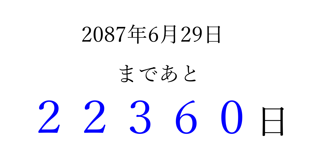 2087年6月29日(日)まで あと 99999 日です 追加すると、トップページからすぐ選べるようになります ※2026/04/10現在の結果です。 最新の状態に更新する ↓シェアして、タイムライン上にカウントダウンを表示しよう!↓ 📤 この結果を共有する Tweet シェア Threads Bluesky 別の日付でカウントダウン 2087年6月のカレンダー このページをブックマークに追加すると、いつでもカウントダウンを確認できます。 (PC: Ctrl+D / Mac: ⌘+D) hitome-notes.comでは以下のページも運営しています。 指定日と期間から日付を計算 | ガチャ確率計算・シミュレーション | プライバシー・ポリシー 運営者:Avocado