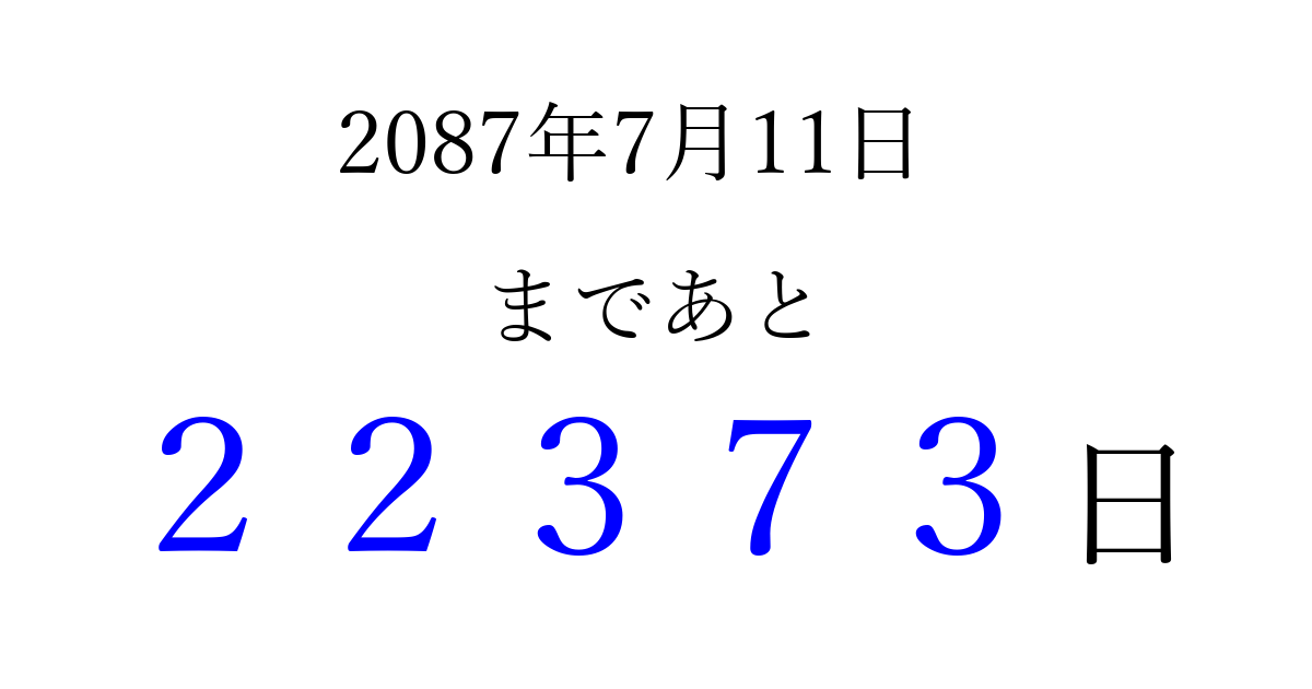 2087年7月11日(金)まで あと 99999 日です 追加すると、トップページからすぐ選べるようになります ※2026/04/09現在の結果です。 最新の状態に更新する ↓シェアして、タイムライン上にカウントダウンを表示しよう!↓ 📤 この結果を共有する Tweet シェア Threads Bluesky 別の日付でカウントダウン 2087年7月のカレンダー このページをブックマークに追加すると、いつでもカウントダウンを確認できます。 (PC: Ctrl+D / Mac: ⌘+D) hitome-notes.comでは以下のページも運営しています。 指定日と期間から日付を計算 | ガチャ確率計算・シミュレーション | プライバシー・ポリシー 運営者:Avocado