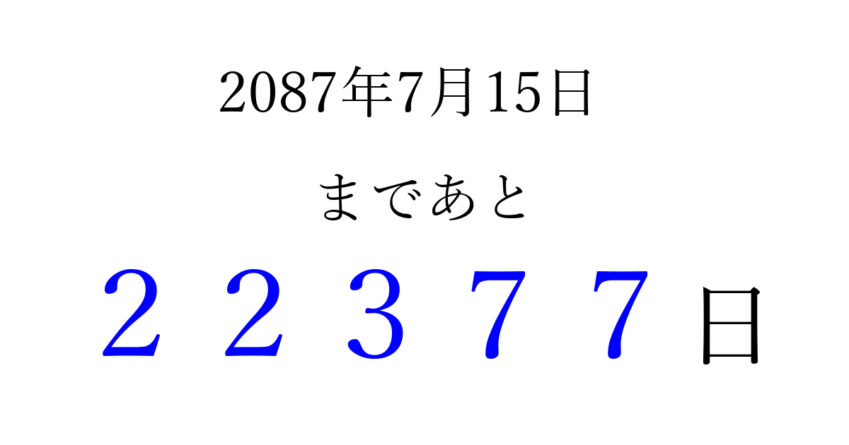 2087年7月15日(火)まで あと 99999 日です 追加すると、トップページからすぐ選べるようになります ※2026/04/09現在の結果です。 最新の状態に更新する ↓シェアして、タイムライン上にカウントダウンを表示しよう!↓ 📤 この結果を共有する Tweet シェア Threads Bluesky 別の日付でカウントダウン 2087年7月のカレンダー このページをブックマークに追加すると、いつでもカウントダウンを確認できます。 (PC: Ctrl+D / Mac: ⌘+D) hitome-notes.comでは以下のページも運営しています。 指定日と期間から日付を計算 | ガチャ確率計算・シミュレーション | プライバシー・ポリシー 運営者:Avocado