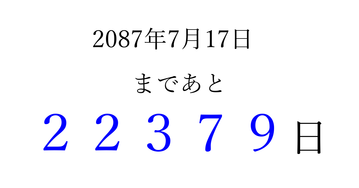 2087年7月17日(木)まで あと 99999 日です 追加すると、トップページからすぐ選べるようになります ※2026/04/09現在の結果です。 最新の状態に更新する ↓シェアして、タイムライン上にカウントダウンを表示しよう!↓ 📤 この結果を共有する Tweet シェア Threads Bluesky 別の日付でカウントダウン 2087年7月のカレンダー このページをブックマークに追加すると、いつでもカウントダウンを確認できます。 (PC: Ctrl+D / Mac: ⌘+D) hitome-notes.comでは以下のページも運営しています。 指定日と期間から日付を計算 | ガチャ確率計算・シミュレーション | プライバシー・ポリシー 運営者:Avocado
