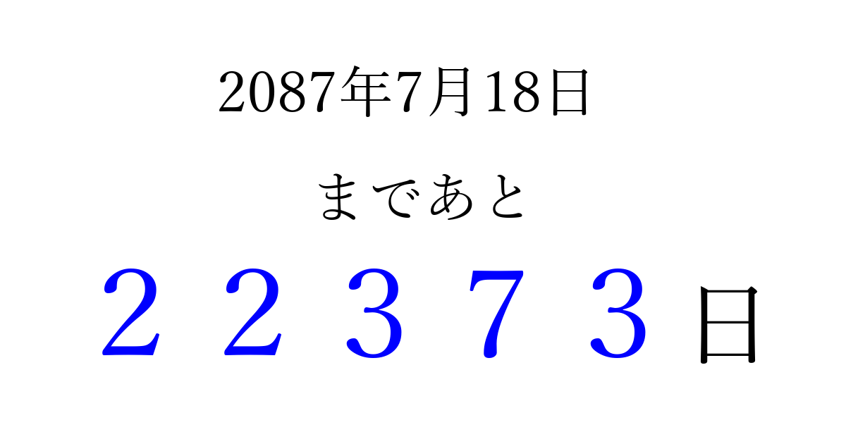 2087年7月18日(金)まで あと 99999 日です 追加すると、トップページからすぐ選べるようになります ※2026/04/16現在の結果です。 最新の状態に更新する ↓シェアして、タイムライン上にカウントダウンを表示しよう!↓ 📤 この結果を共有する Tweet シェア Threads Bluesky 別の日付でカウントダウン 2087年7月のカレンダー このページをブックマークに追加すると、いつでもカウントダウンを確認できます。 (PC: Ctrl+D / Mac: ⌘+D) hitome-notes.comでは以下のページも運営しています。 指定日と期間から日付を計算 | ガチャ確率計算・シミュレーション | プライバシー・ポリシー 運営者:Avocado