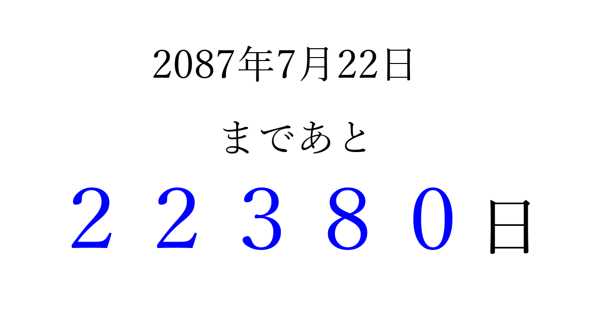 2087年7月22日(火)まで あと 99999 日です 追加すると、トップページからすぐ選べるようになります ※2026/04/13現在の結果です。 最新の状態に更新する ↓シェアして、タイムライン上にカウントダウンを表示しよう!↓ 📤 この結果を共有する Tweet シェア Threads Bluesky 別の日付でカウントダウン 2087年7月のカレンダー このページをブックマークに追加すると、いつでもカウントダウンを確認できます。 (PC: Ctrl+D / Mac: ⌘+D) hitome-notes.comでは以下のページも運営しています。 指定日と期間から日付を計算 | ガチャ確率計算・シミュレーション | プライバシー・ポリシー 運営者:Avocado