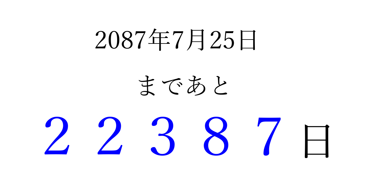 2087年7月25日(金)まで あと 99999 日です 追加すると、トップページからすぐ選べるようになります ※2026/04/09現在の結果です。 最新の状態に更新する ↓シェアして、タイムライン上にカウントダウンを表示しよう!↓ 📤 この結果を共有する Tweet シェア Threads Bluesky 別の日付でカウントダウン 2087年7月のカレンダー このページをブックマークに追加すると、いつでもカウントダウンを確認できます。 (PC: Ctrl+D / Mac: ⌘+D) hitome-notes.comでは以下のページも運営しています。 指定日と期間から日付を計算 | ガチャ確率計算・シミュレーション | プライバシー・ポリシー 運営者:Avocado