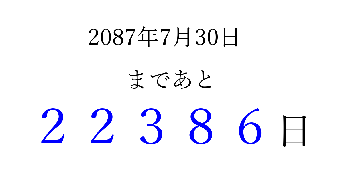 2087年7月30日(水)まで あと 99999 日です 追加すると、トップページからすぐ選べるようになります ※2026/04/15現在の結果です。 最新の状態に更新する ↓シェアして、タイムライン上にカウントダウンを表示しよう!↓ 📤 この結果を共有する Tweet シェア Threads Bluesky 別の日付でカウントダウン 2087年7月のカレンダー このページをブックマークに追加すると、いつでもカウントダウンを確認できます。 (PC: Ctrl+D / Mac: ⌘+D) hitome-notes.comでは以下のページも運営しています。 指定日と期間から日付を計算 | ガチャ確率計算・シミュレーション | プライバシー・ポリシー 運営者:Avocado