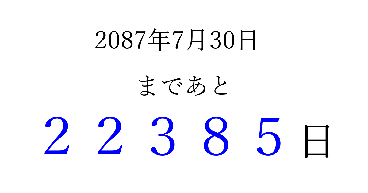 2087年7月30日(水)まで あと 99999 日です 追加すると、トップページからすぐ選べるようになります ※2026/04/16現在の結果です。 最新の状態に更新する ↓シェアして、タイムライン上にカウントダウンを表示しよう!↓ 📤 この結果を共有する Tweet シェア Threads Bluesky 別の日付でカウントダウン 2087年7月のカレンダー このページをブックマークに追加すると、いつでもカウントダウンを確認できます。 (PC: Ctrl+D / Mac: ⌘+D) hitome-notes.comでは以下のページも運営しています。 指定日と期間から日付を計算 | ガチャ確率計算・シミュレーション | プライバシー・ポリシー 運営者:Avocado