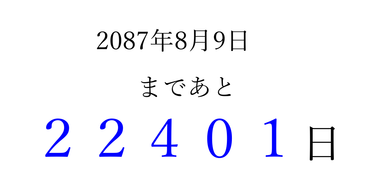 2087年8月9日(土)まで あと 99999 日です 追加すると、トップページからすぐ選べるようになります ※2026/04/10現在の結果です。 最新の状態に更新する ↓シェアして、タイムライン上にカウントダウンを表示しよう!↓ 📤 この結果を共有する Tweet シェア Threads Bluesky 別の日付でカウントダウン 2087年8月のカレンダー このページをブックマークに追加すると、いつでもカウントダウンを確認できます。 (PC: Ctrl+D / Mac: ⌘+D) hitome-notes.comでは以下のページも運営しています。 指定日と期間から日付を計算 | ガチャ確率計算・シミュレーション | プライバシー・ポリシー 運営者:Avocado