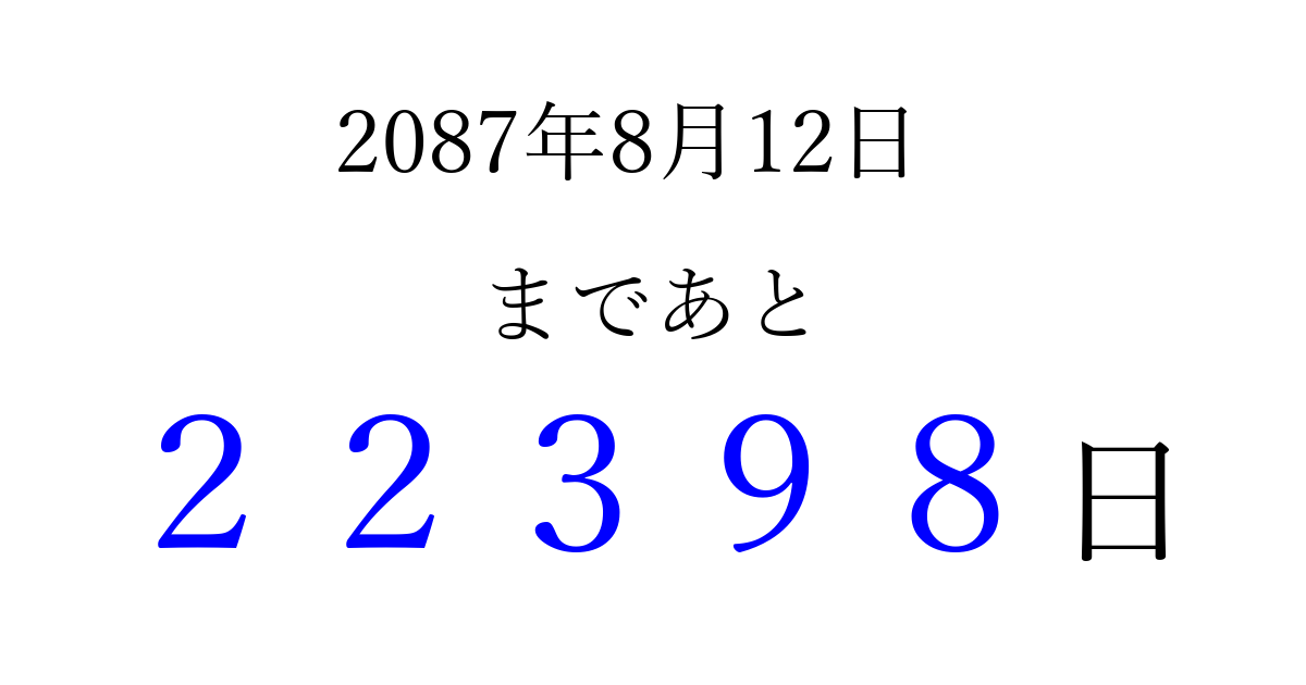 2087年8月12日(火)まで あと 99999 日です 追加すると、トップページからすぐ選べるようになります ※2026/04/16現在の結果です。 最新の状態に更新する ↓シェアして、タイムライン上にカウントダウンを表示しよう!↓ 📤 この結果を共有する Tweet シェア Threads Bluesky 別の日付でカウントダウン 2087年8月のカレンダー このページをブックマークに追加すると、いつでもカウントダウンを確認できます。 (PC: Ctrl+D / Mac: ⌘+D) hitome-notes.comでは以下のページも運営しています。 指定日と期間から日付を計算 | ガチャ確率計算・シミュレーション | プライバシー・ポリシー 運営者:Avocado