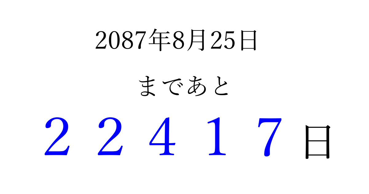 2087年8月25日(月)まで あと 99999 日です 追加すると、トップページからすぐ選べるようになります ※2026/04/10現在の結果です。 最新の状態に更新する ↓シェアして、タイムライン上にカウントダウンを表示しよう!↓ 📤 この結果を共有する Tweet シェア Threads Bluesky 別の日付でカウントダウン 2087年8月のカレンダー このページをブックマークに追加すると、いつでもカウントダウンを確認できます。 (PC: Ctrl+D / Mac: ⌘+D) hitome-notes.comでは以下のページも運営しています。 指定日と期間から日付を計算 | ガチャ確率計算・シミュレーション | プライバシー・ポリシー 運営者:Avocado
