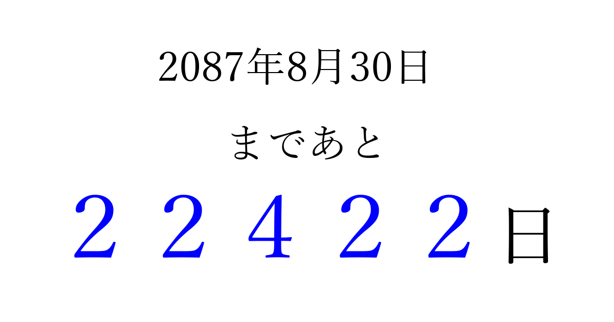 2087年8月30日(土)まで あと 99999 日です 追加すると、トップページからすぐ選べるようになります ※2026/04/10現在の結果です。 最新の状態に更新する ↓シェアして、タイムライン上にカウントダウンを表示しよう!↓ 📤 この結果を共有する Tweet シェア Threads Bluesky 別の日付でカウントダウン 2087年8月のカレンダー このページをブックマークに追加すると、いつでもカウントダウンを確認できます。 (PC: Ctrl+D / Mac: ⌘+D) hitome-notes.comでは以下のページも運営しています。 指定日と期間から日付を計算 | ガチャ確率計算・シミュレーション | プライバシー・ポリシー 運営者:Avocado