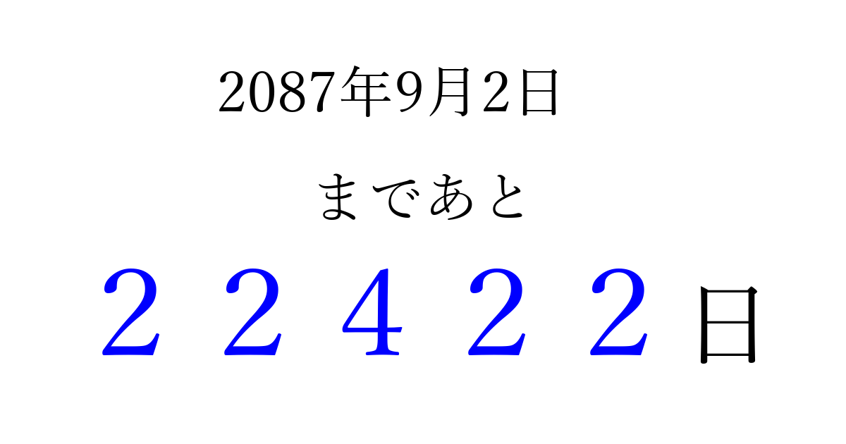 2087年9月2日(火)まで あと 99999 日です 追加すると、トップページからすぐ選べるようになります ※2026/04/13現在の結果です。 最新の状態に更新する ↓シェアして、タイムライン上にカウントダウンを表示しよう!↓ 📤 この結果を共有する Tweet シェア Threads Bluesky 別の日付でカウントダウン 2087年9月のカレンダー このページをブックマークに追加すると、いつでもカウントダウンを確認できます。 (PC: Ctrl+D / Mac: ⌘+D) hitome-notes.comでは以下のページも運営しています。 指定日と期間から日付を計算 | ガチャ確率計算・シミュレーション | プライバシー・ポリシー 運営者:Avocado