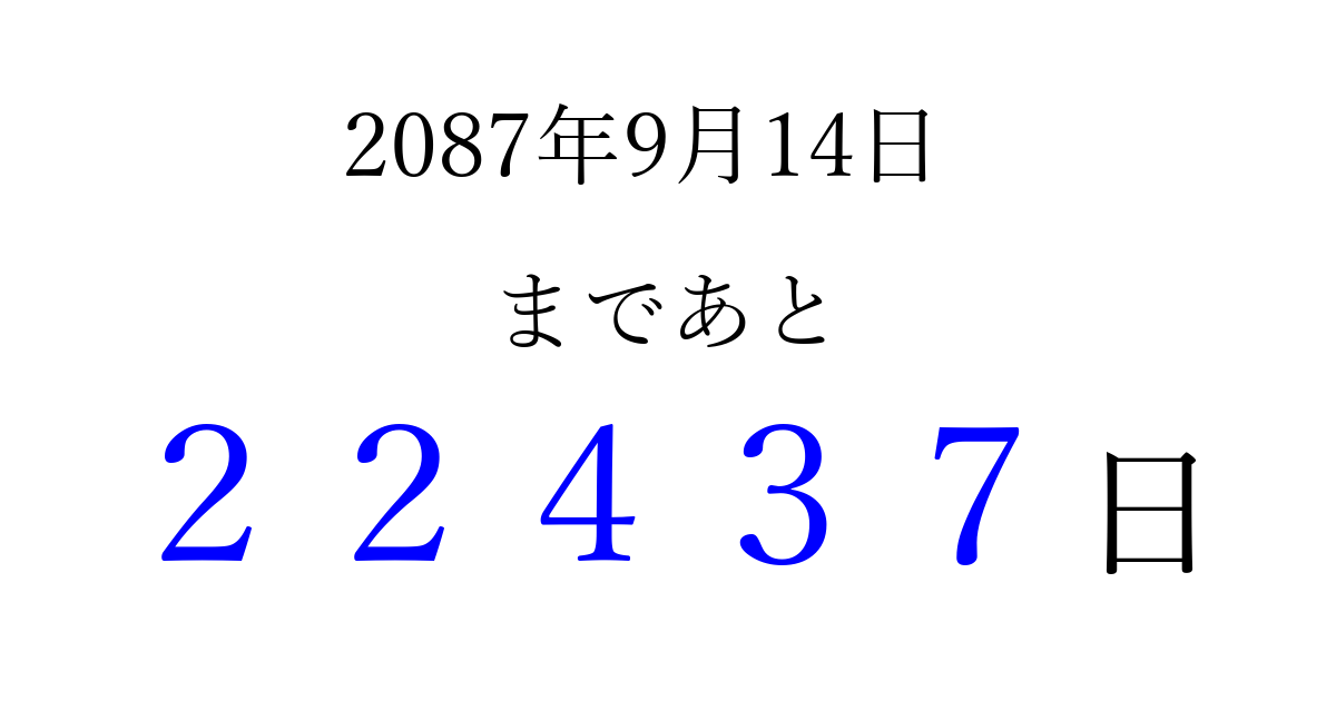 2087年9月14日(日)まで あと 99999 日です 追加すると、トップページからすぐ選べるようになります ※2026/04/10現在の結果です。 最新の状態に更新する ↓シェアして、タイムライン上にカウントダウンを表示しよう!↓ 📤 この結果を共有する Tweet シェア Threads Bluesky 別の日付でカウントダウン 2087年9月のカレンダー このページをブックマークに追加すると、いつでもカウントダウンを確認できます。 (PC: Ctrl+D / Mac: ⌘+D) hitome-notes.comでは以下のページも運営しています。 指定日と期間から日付を計算 | ガチャ確率計算・シミュレーション | プライバシー・ポリシー 運営者:Avocado
