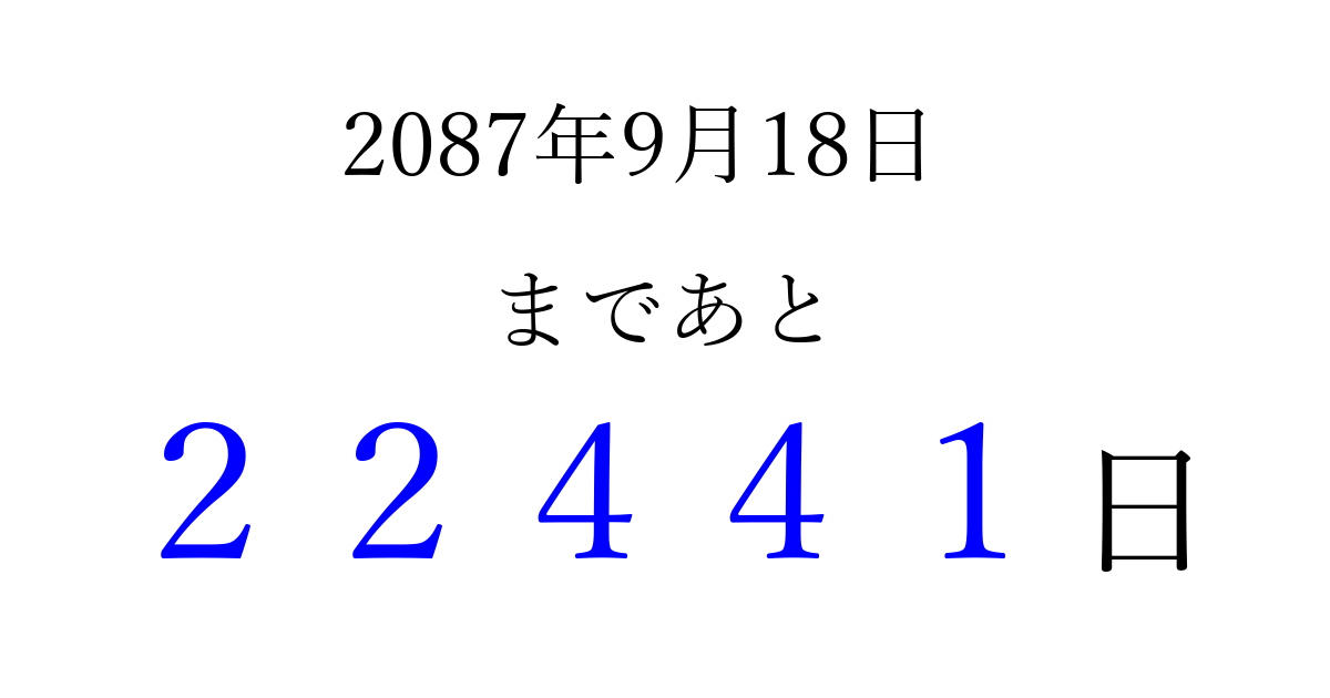2087年9月18日(木)まで あと 99999 日です 追加すると、トップページからすぐ選べるようになります ※2026/04/10現在の結果です。 最新の状態に更新する ↓シェアして、タイムライン上にカウントダウンを表示しよう!↓ 📤 この結果を共有する Tweet シェア Threads Bluesky 別の日付でカウントダウン 2087年9月のカレンダー このページをブックマークに追加すると、いつでもカウントダウンを確認できます。 (PC: Ctrl+D / Mac: ⌘+D) hitome-notes.comでは以下のページも運営しています。 指定日と期間から日付を計算 | ガチャ確率計算・シミュレーション | プライバシー・ポリシー 運営者:Avocado