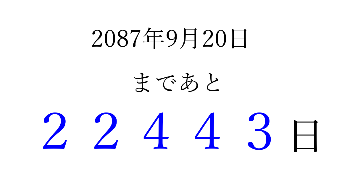 2087年9月20日(土)まで あと 99999 日です 追加すると、トップページからすぐ選べるようになります ※2026/04/10現在の結果です。 最新の状態に更新する ↓シェアして、タイムライン上にカウントダウンを表示しよう!↓ 📤 この結果を共有する Tweet シェア Threads Bluesky 別の日付でカウントダウン 2087年9月のカレンダー このページをブックマークに追加すると、いつでもカウントダウンを確認できます。 (PC: Ctrl+D / Mac: ⌘+D) hitome-notes.comでは以下のページも運営しています。 指定日と期間から日付を計算 | ガチャ確率計算・シミュレーション | プライバシー・ポリシー 運営者:Avocado