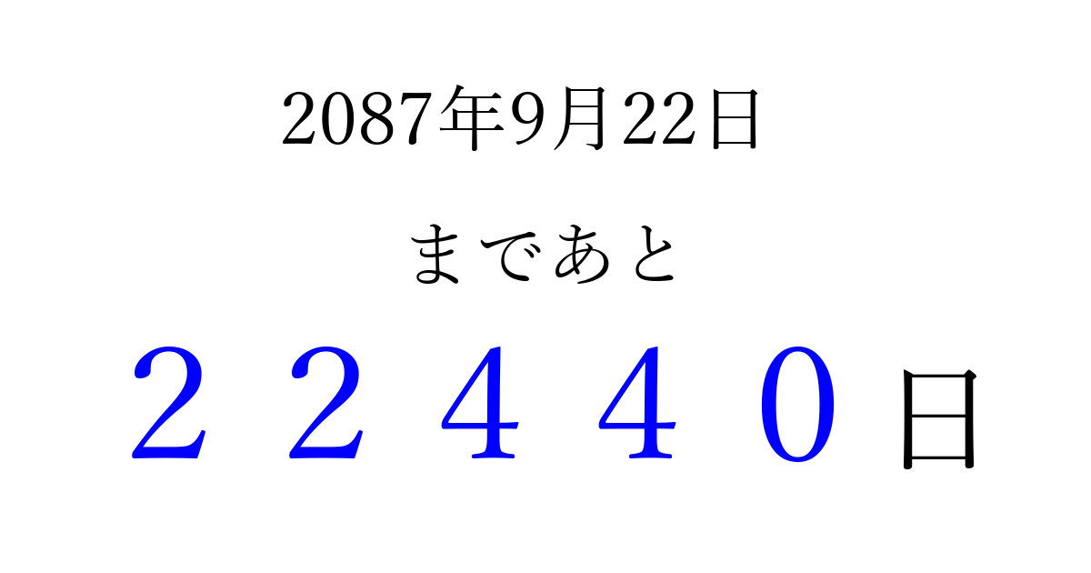 2087年9月22日(月)まで あと 99999 日です 追加すると、トップページからすぐ選べるようになります ※2026/04/15現在の結果です。 最新の状態に更新する ↓シェアして、タイムライン上にカウントダウンを表示しよう!↓ 📤 この結果を共有する Tweet シェア Threads Bluesky 別の日付でカウントダウン 2087年9月のカレンダー このページをブックマークに追加すると、いつでもカウントダウンを確認できます。 (PC: Ctrl+D / Mac: ⌘+D) hitome-notes.comでは以下のページも運営しています。 指定日と期間から日付を計算 | ガチャ確率計算・シミュレーション | プライバシー・ポリシー 運営者:Avocado