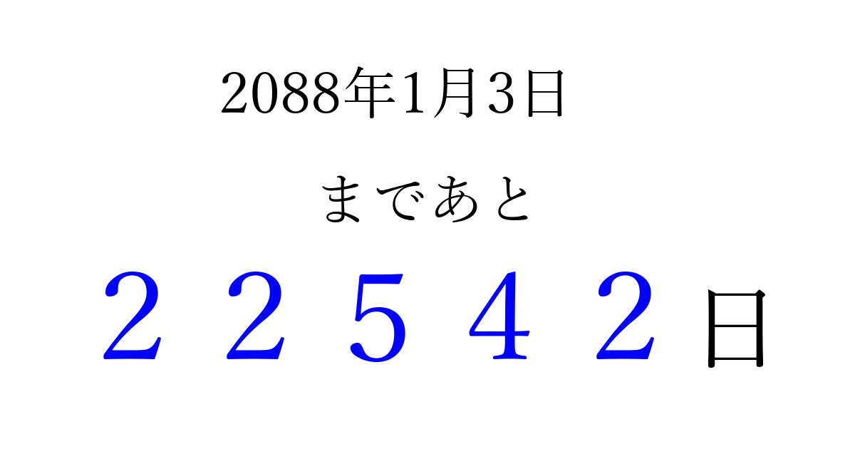 2088年1月3日(土)まで あと 99999 日です 追加すると、トップページからすぐ選べるようになります ※2026/04/16現在の結果です。 最新の状態に更新する ↓シェアして、タイムライン上にカウントダウンを表示しよう!↓ 📤 この結果を共有する Tweet シェア Threads Bluesky 別の日付でカウントダウン 2088年1月のカレンダー このページをブックマークに追加すると、いつでもカウントダウンを確認できます。 (PC: Ctrl+D / Mac: ⌘+D) hitome-notes.comでは以下のページも運営しています。 指定日と期間から日付を計算 | ガチャ確率計算・シミュレーション | プライバシー・ポリシー 運営者:Avocado