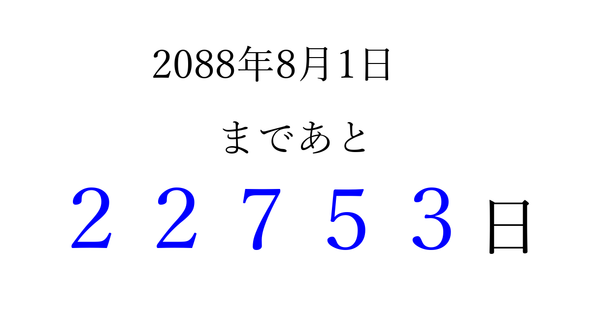 2088年8月1日(日)まで あと 99999 日です 追加すると、トップページからすぐ選べるようになります ※2026/04/16現在の結果です。 最新の状態に更新する ↓シェアして、タイムライン上にカウントダウンを表示しよう!↓ 📤 この結果を共有する Tweet シェア Threads Bluesky 別の日付でカウントダウン 2088年8月のカレンダー このページをブックマークに追加すると、いつでもカウントダウンを確認できます。 (PC: Ctrl+D / Mac: ⌘+D) hitome-notes.comでは以下のページも運営しています。 指定日と期間から日付を計算 | ガチャ確率計算・シミュレーション | プライバシー・ポリシー 運営者:Avocado