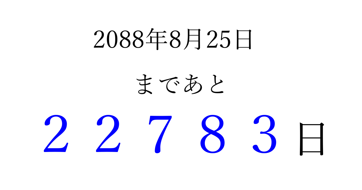 2088年8月25日(水)まで あと 99999 日です 追加すると、トップページからすぐ選べるようになります ※2026/04/10現在の結果です。 最新の状態に更新する ↓シェアして、タイムライン上にカウントダウンを表示しよう!↓ 📤 この結果を共有する Tweet シェア Threads Bluesky 別の日付でカウントダウン 2088年8月のカレンダー このページをブックマークに追加すると、いつでもカウントダウンを確認できます。 (PC: Ctrl+D / Mac: ⌘+D) hitome-notes.comでは以下のページも運営しています。 指定日と期間から日付を計算 | ガチャ確率計算・シミュレーション | プライバシー・ポリシー 運営者:Avocado