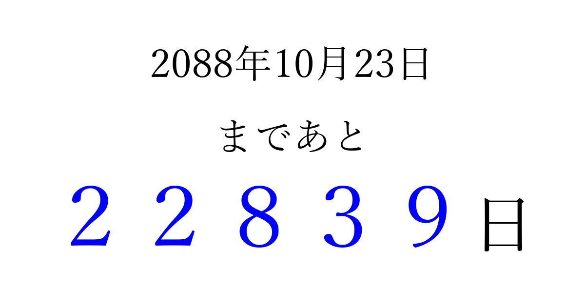 2088年10月23日(土)まで あと 99999 日です 追加すると、トップページからすぐ選べるようになります ※2026/04/13現在の結果です。 最新の状態に更新する ↓シェアして、タイムライン上にカウントダウンを表示しよう!↓ 📤 この結果を共有する Tweet シェア Threads Bluesky 別の日付でカウントダウン 2088年10月のカレンダー このページをブックマークに追加すると、いつでもカウントダウンを確認できます。 (PC: Ctrl+D / Mac: ⌘+D) hitome-notes.comでは以下のページも運営しています。 指定日と期間から日付を計算 | ガチャ確率計算・シミュレーション | プライバシー・ポリシー 運営者:Avocado