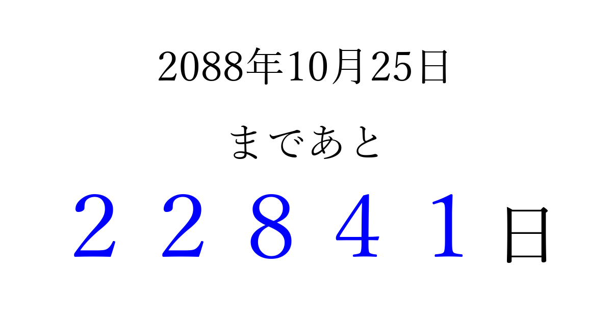2088年10月25日(月)まで あと 99999 日です 追加すると、トップページからすぐ選べるようになります ※2026/04/13現在の結果です。 最新の状態に更新する ↓シェアして、タイムライン上にカウントダウンを表示しよう!↓ 📤 この結果を共有する Tweet シェア Threads Bluesky 別の日付でカウントダウン 2088年10月のカレンダー このページをブックマークに追加すると、いつでもカウントダウンを確認できます。 (PC: Ctrl+D / Mac: ⌘+D) hitome-notes.comでは以下のページも運営しています。 指定日と期間から日付を計算 | ガチャ確率計算・シミュレーション | プライバシー・ポリシー 運営者:Avocado