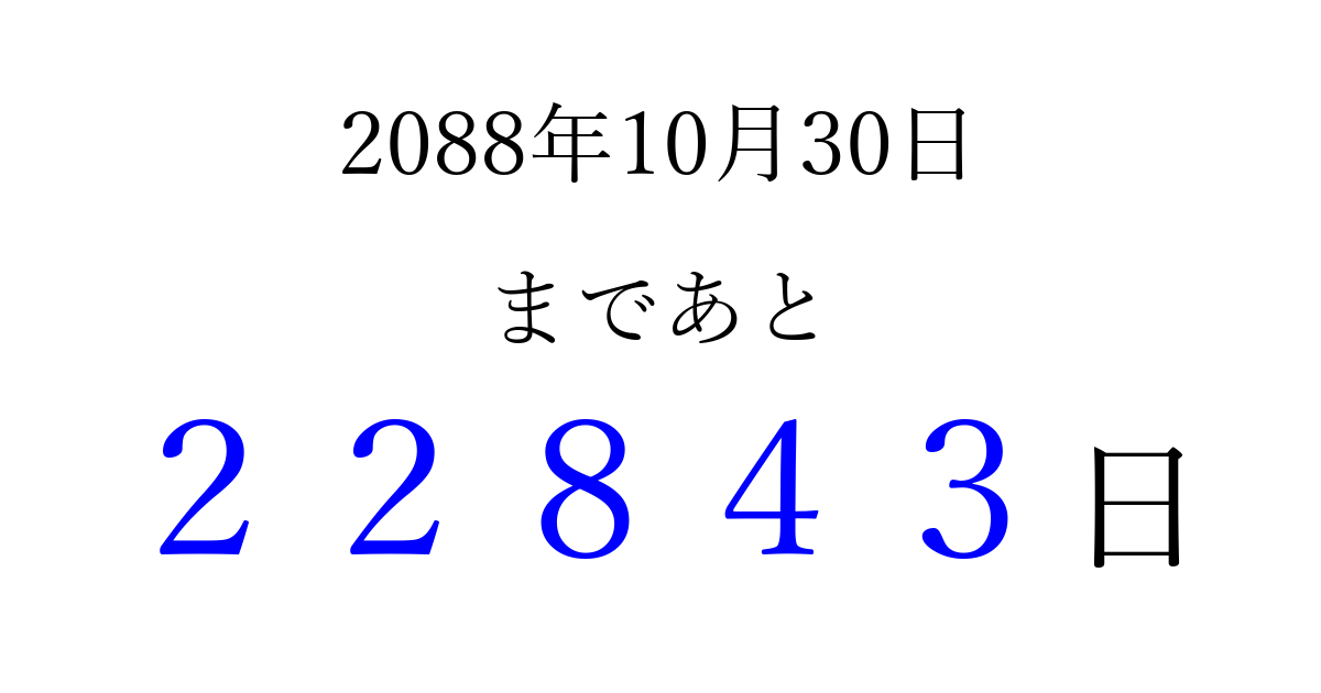 2088年10月30日(土)まで あと 99999 日です 追加すると、トップページからすぐ選べるようになります ※2026/04/16現在の結果です。 最新の状態に更新する ↓シェアして、タイムライン上にカウントダウンを表示しよう!↓ 📤 この結果を共有する Tweet シェア Threads Bluesky 別の日付でカウントダウン 2088年10月のカレンダー このページをブックマークに追加すると、いつでもカウントダウンを確認できます。 (PC: Ctrl+D / Mac: ⌘+D) hitome-notes.comでは以下のページも運営しています。 指定日と期間から日付を計算 | ガチャ確率計算・シミュレーション | プライバシー・ポリシー 運営者:Avocado