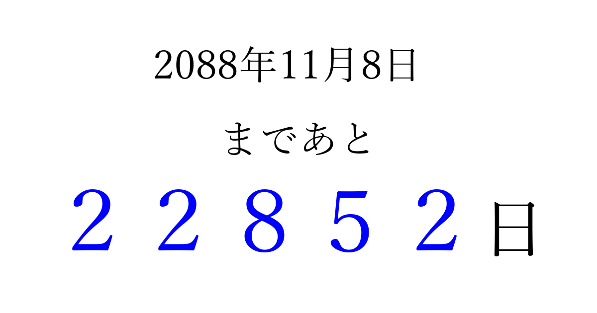 2088年11月8日(月)まで あと 99999 日です 追加すると、トップページからすぐ選べるようになります ※2026/04/16現在の結果です。 最新の状態に更新する ↓シェアして、タイムライン上にカウントダウンを表示しよう!↓ 📤 この結果を共有する Tweet シェア Threads Bluesky 別の日付でカウントダウン 2088年11月のカレンダー このページをブックマークに追加すると、いつでもカウントダウンを確認できます。 (PC: Ctrl+D / Mac: ⌘+D) hitome-notes.comでは以下のページも運営しています。 指定日と期間から日付を計算 | ガチャ確率計算・シミュレーション | プライバシー・ポリシー 運営者:Avocado