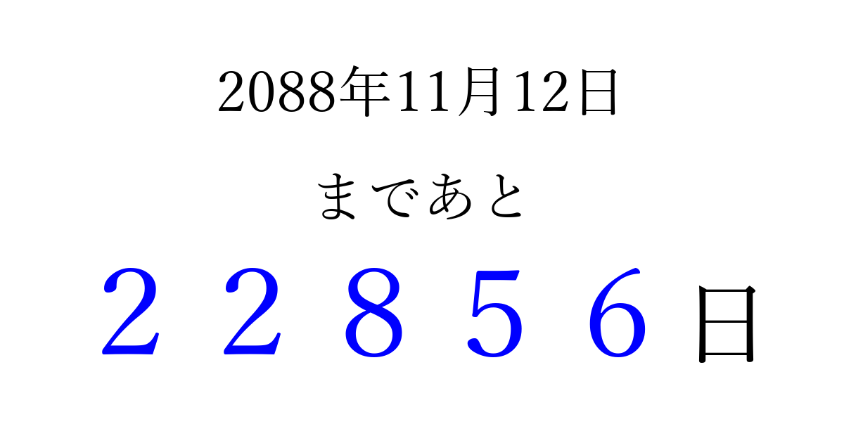 2088年11月12日(金)まで あと 99999 日です 追加すると、トップページからすぐ選べるようになります ※2026/04/16現在の結果です。 最新の状態に更新する ↓シェアして、タイムライン上にカウントダウンを表示しよう!↓ 📤 この結果を共有する Tweet シェア Threads Bluesky 別の日付でカウントダウン 2088年11月のカレンダー このページをブックマークに追加すると、いつでもカウントダウンを確認できます。 (PC: Ctrl+D / Mac: ⌘+D) hitome-notes.comでは以下のページも運営しています。 指定日と期間から日付を計算 | ガチャ確率計算・シミュレーション | プライバシー・ポリシー 運営者:Avocado